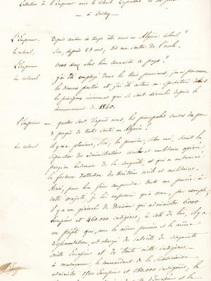 Le Colonel : Il y en a plusieurs, sire ; la première selon moi, serait la séparation des administrations civile et militaire opérée presqu’au lendemain de la conquête, et qui a entrainé la fâcheuse distinction des territoires civils et militaires. Ainsi, pour bien faire comprendre toute ma pensée à votre majesté, je lui exposerai qu’à Oran, par exemple, il y a un général de division qui administre 6000 européens et 460 000 indigènes ; à côté de lui il y a un préfet qui, avec les mêmes pouvoirs et la même règlementation, est chargé des intérêts de cinquante mille européens et de trente mille indigènes. […] En multipliant les rouages on a multiplié les fonctionnaires et les dépenses en dehors de toute proportion avec le nombre des administrés.