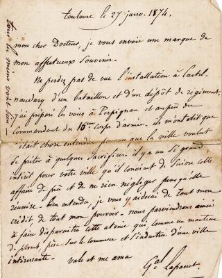 Chère amie, tu es un charmant agent électoral, on ne pouvait faire mieux. Après la lecture de ta lettre du 20 [mars]qui m’est parvenue hier en même temps que celle du 22, je pense qu’il faut stopper pour le moment. La France est si troublée que ce serait folie de songer à compléter l’Assemblée ou à renouveler les conseils généraux, tout au plus voudra t-on procéder à l’élection des municipalités pendant que M. Thiers aura cette sagesse et qu’il saura attendre que le calme soit un peu revenu pour faire n’importe quelles élections, nous devons faire comme lui. S’il en était autrement, examinons les cas. Je serais d’avis de ne pas poser ma candidature s’il ne s’agit que d’une élection partielle. Dans le cas d’une constituante, je la poserais dans les arrondissements de Limoux et de Castelnaudary.[…]