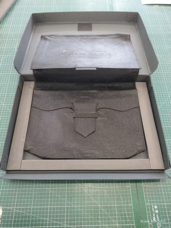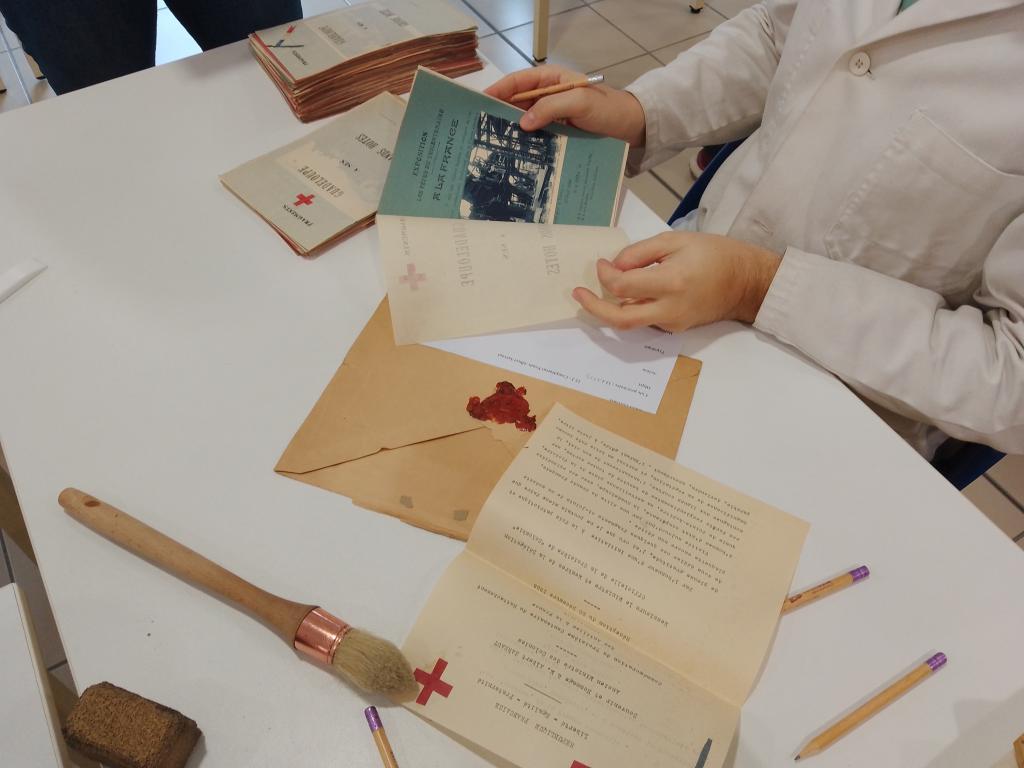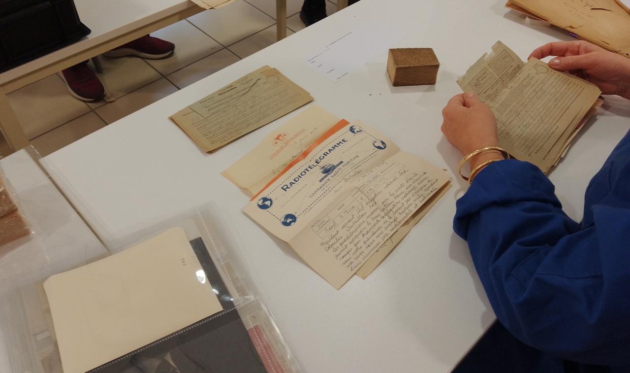 Afin d'assurer une bonne consultation et une bonne conservation des documents, toutes ces pièces ont été dépoussiérées, une réflexion sur la mise à plat des tirages photographiques bombés est en cours, et des conditionnements sur mesure ont été réalisés pour les objets contenus dans ce fonds (tampons, porte document, sous-main).